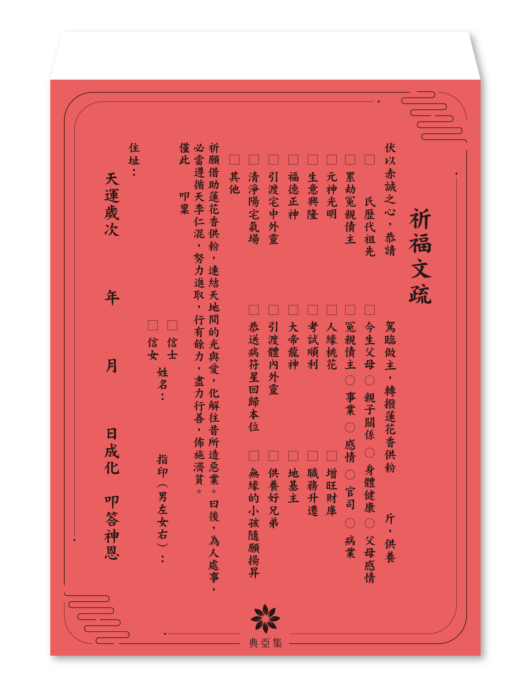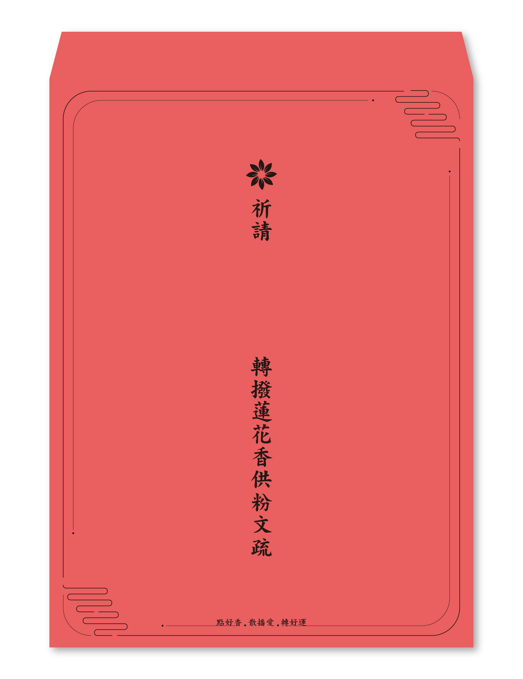 每一包蓮花香供粉裡皆有附贈專用文疏袋,可依願望或需求寫下個人心願與正向用詞,將祝福與善念完整轉撥。